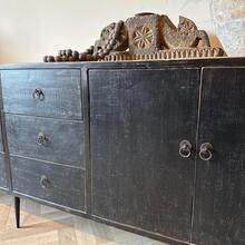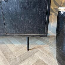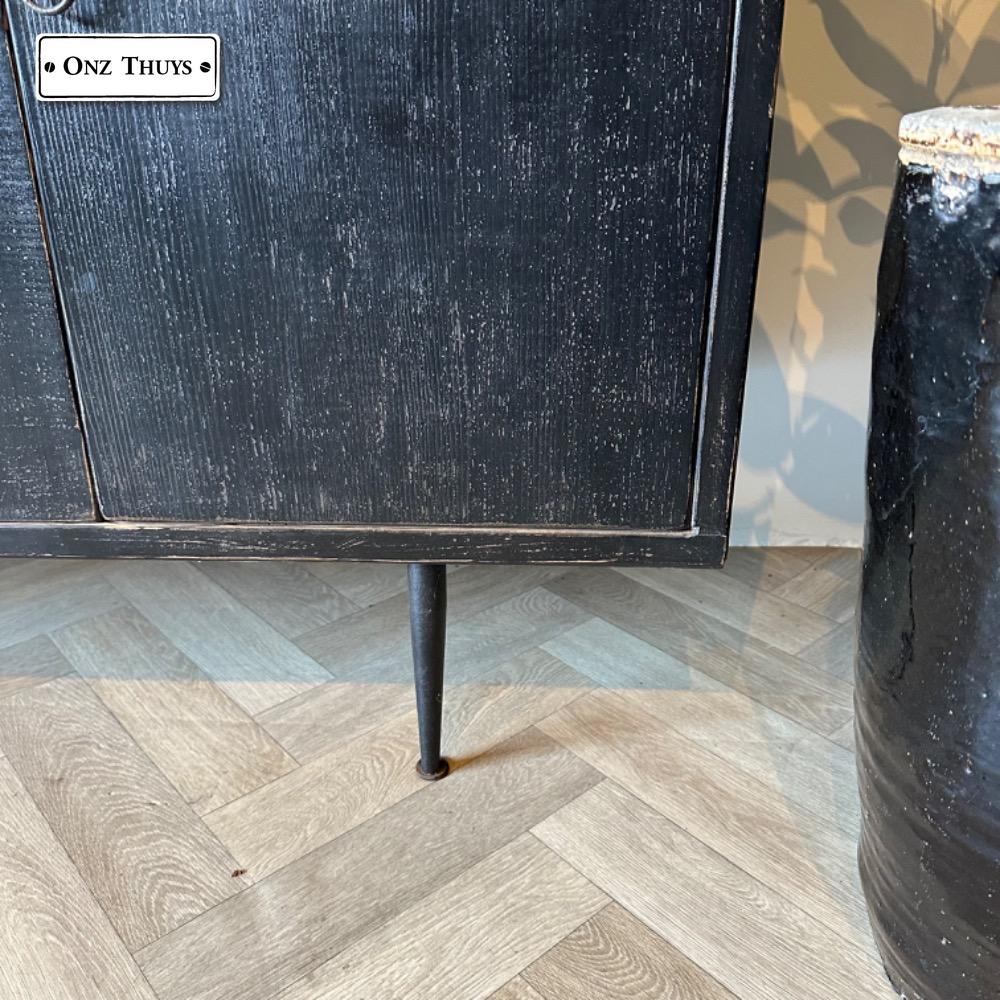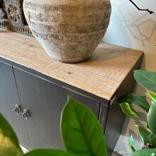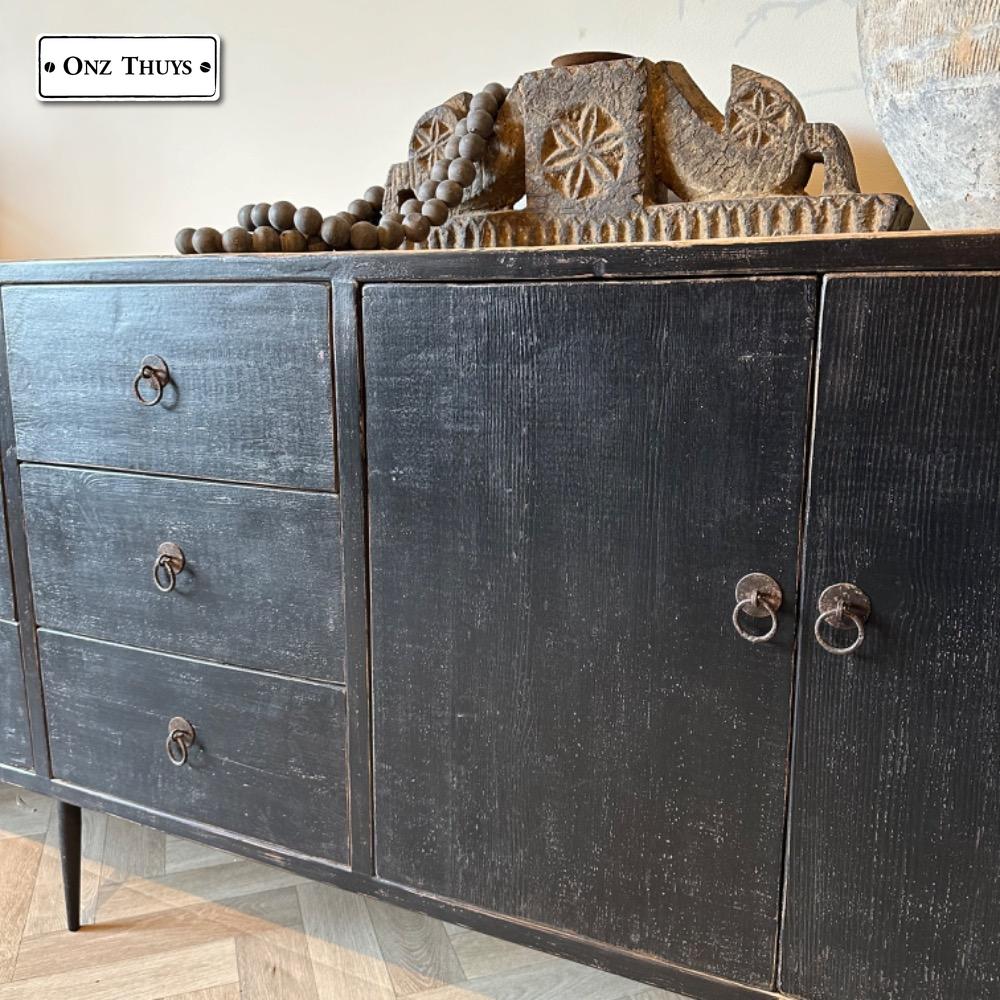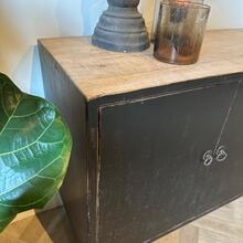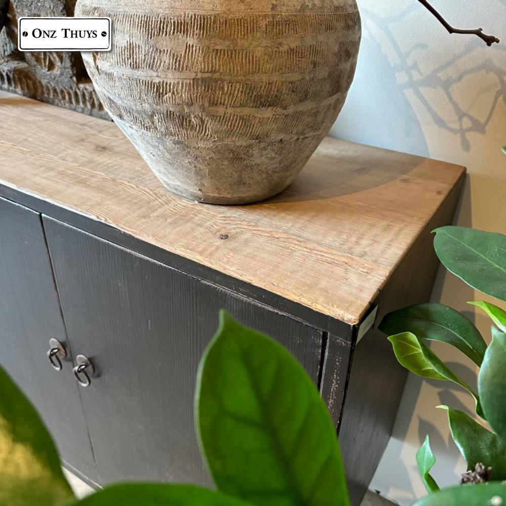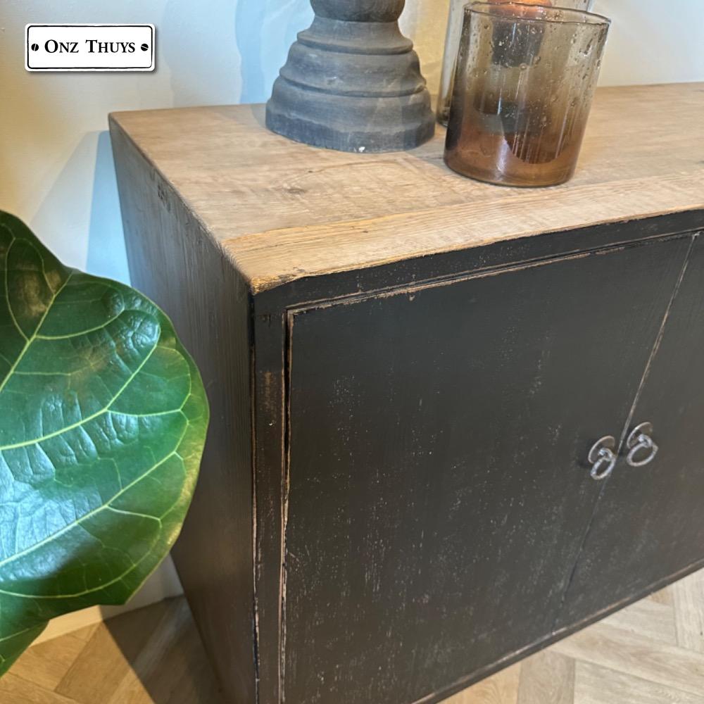 de kast is afgewerkt in Old Black met gecombineerd met een naturel top .