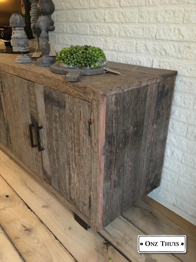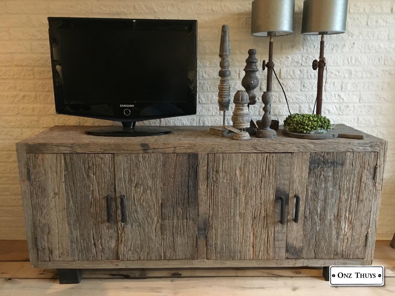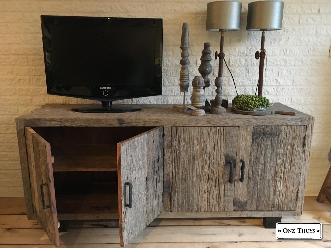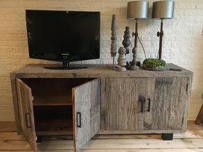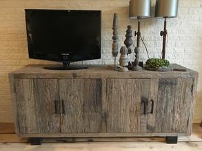 Stoer industriel landelijk driftwood tv meubel, met 4 deuren, Dit tv meubel past mooi in een landelijk, stoer, stijlvol interieur.
