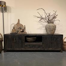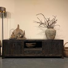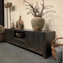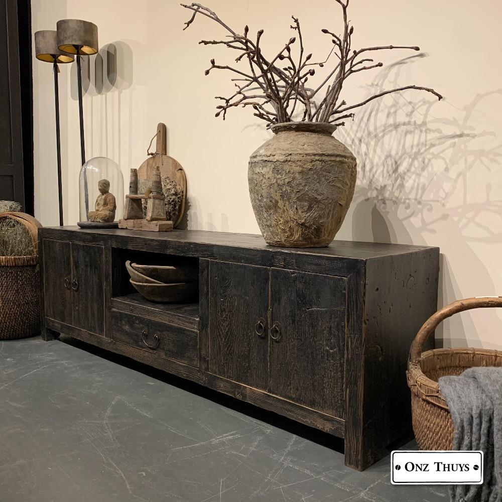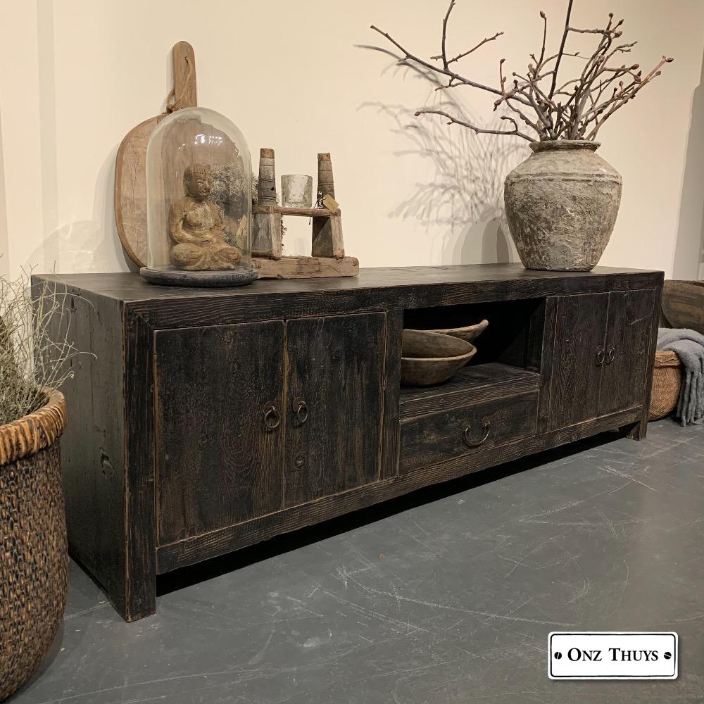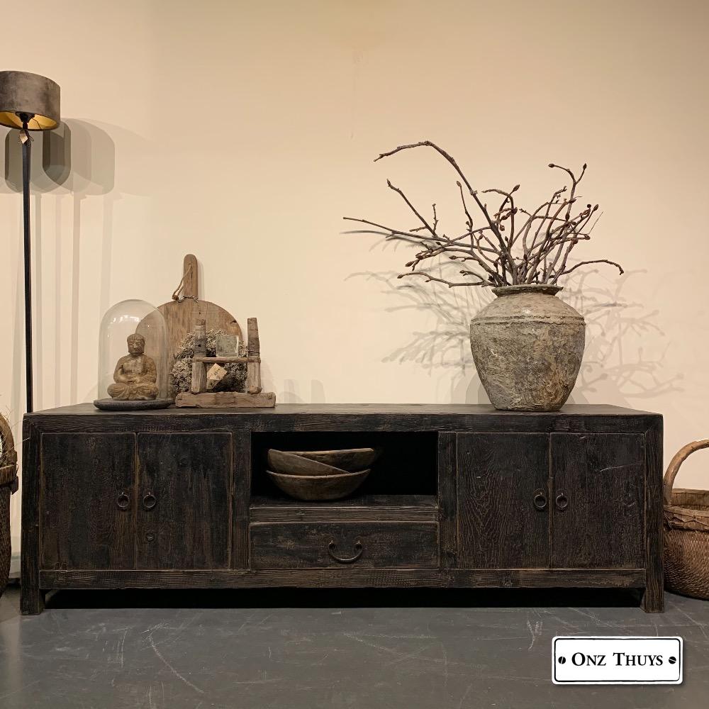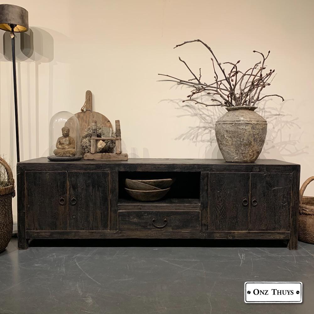 De tv kast heeft 1 lade en 4 deurtjes . Robuuste tv-kast van oud doorleefd Chinees elmwood.