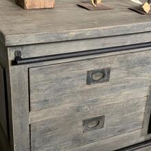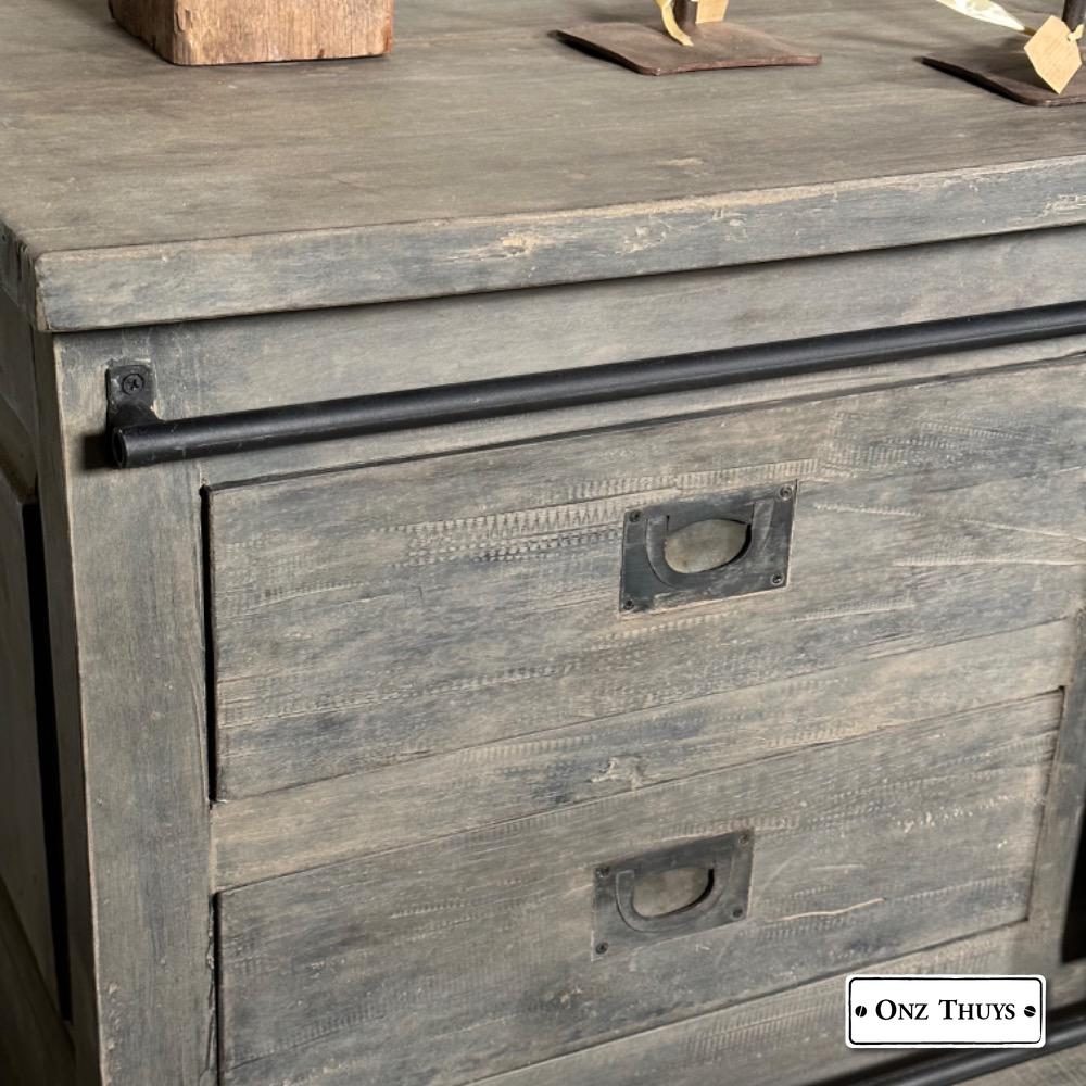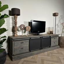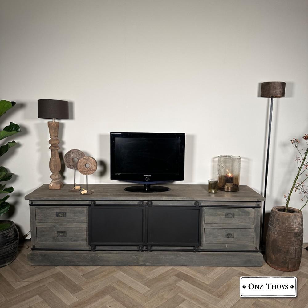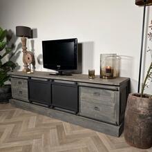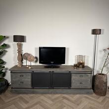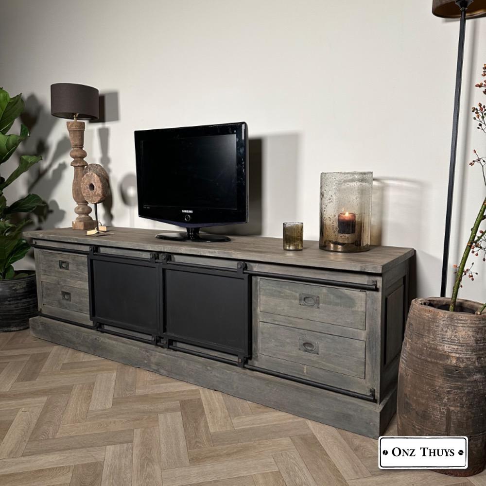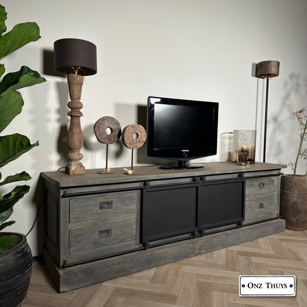 Tv meubel in vergrijst oud teakhout met schuifdeuren in antraciet zwart staal. Dit meubel past in een sober, landelijk hotel chiq interieur.