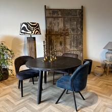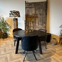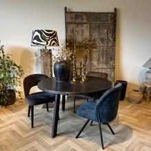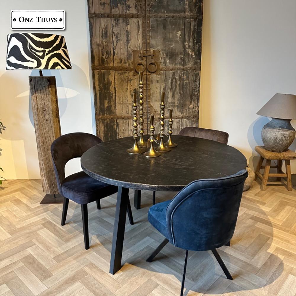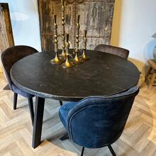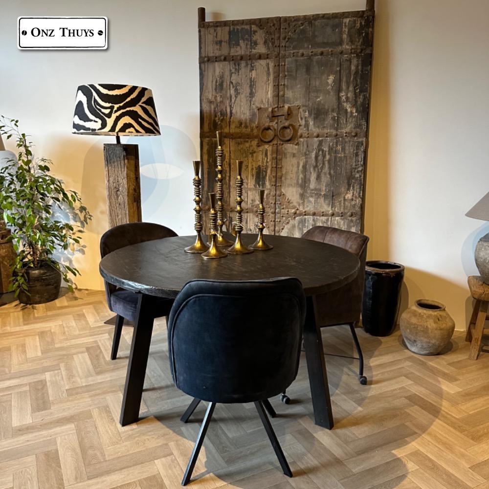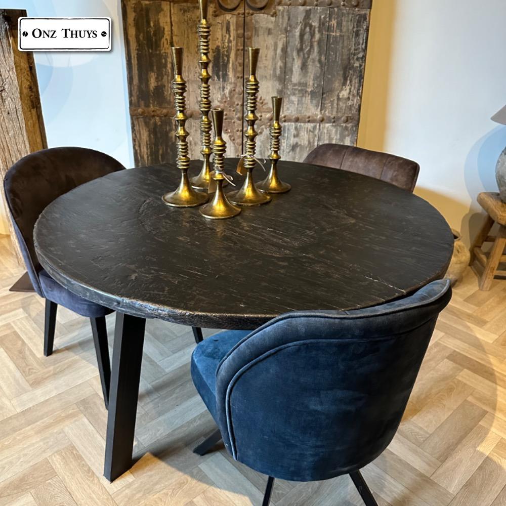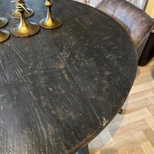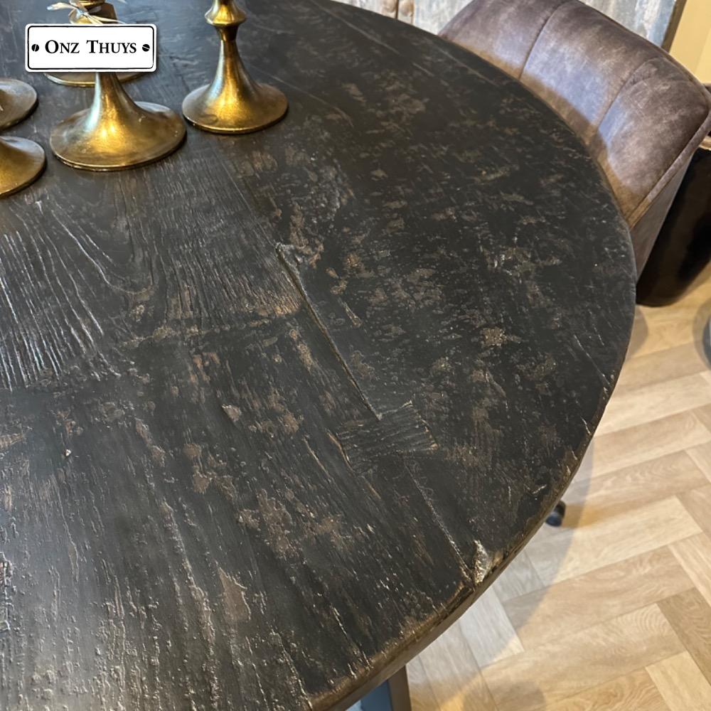 Eettafel met mooi rond oud elm blad in old black met stalen poten
