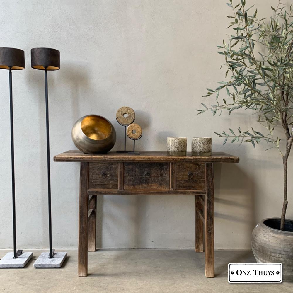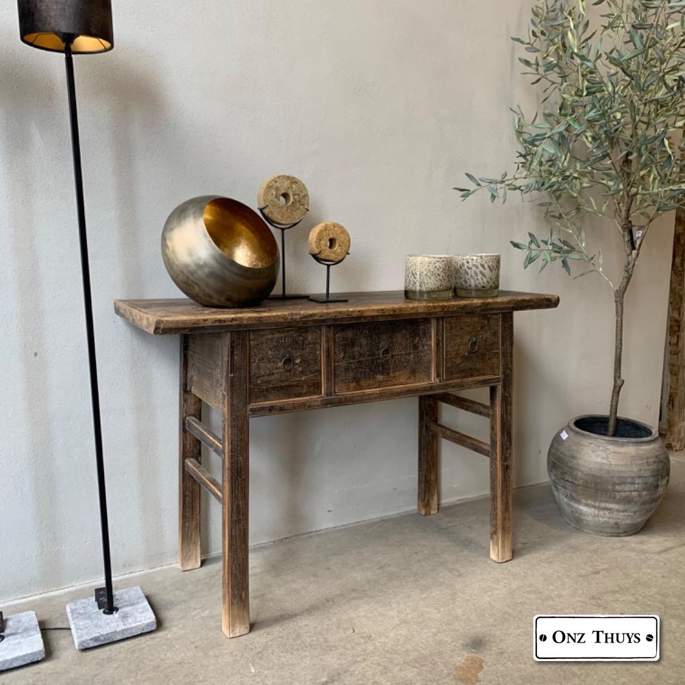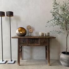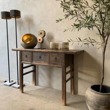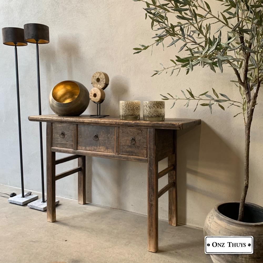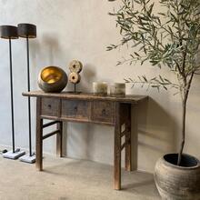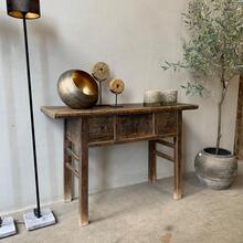 Oude unieke originele Chinese wandtafel met 3 lade. met een authentiek notenhouten blad.